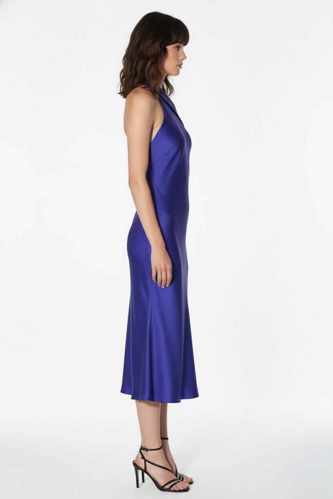 Midi haljina od brušene svile sa trakom oko vrata i skrivenim kopčanjem sa strane. Postavljena i širi se ispod pojasa.