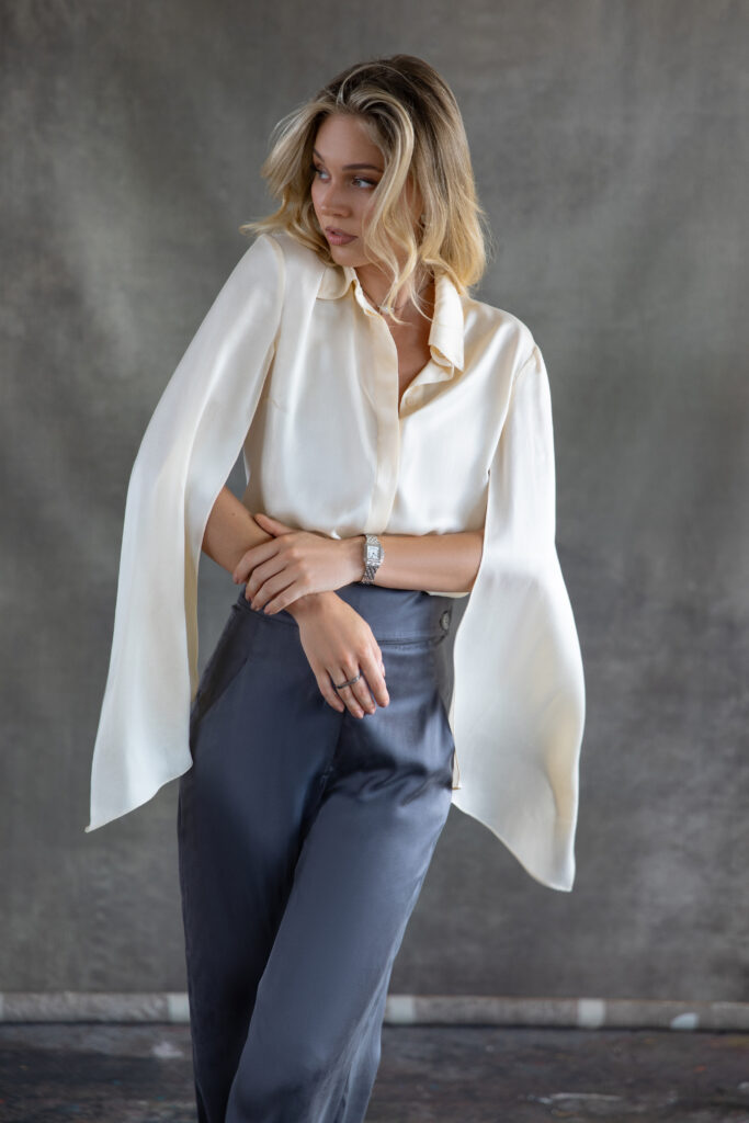 White Icon košulja je bezvremenski izraz moderne elegancije. Izrađena od glatke, prozračne svile, prelepo se prelama preko tela, pružajući lagan osećaj i suptilan, prirodan sjaj. Otvoreni rukavi dodaju opušten, a ipak sofisticiran akcenat, omogućavajući graciozan pokret i prozračnu udobnost. Ova košulja oličava svestranost – savršena je za podizanje kako dnevnih, tako i večernjih kombinacija uz nenametljivo samopouzdanje.